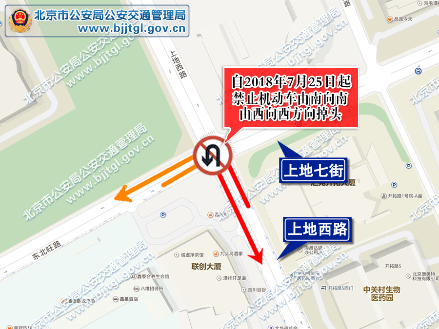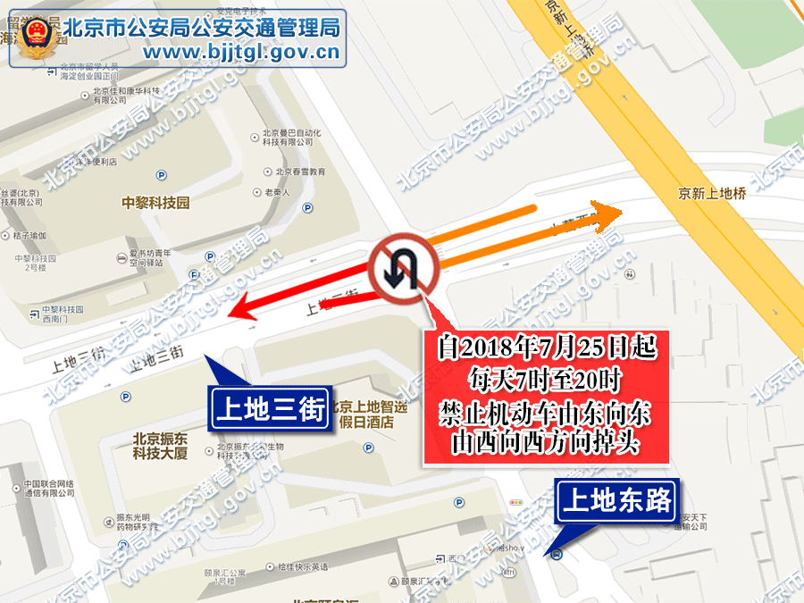 一、上地三街与上地东路交叉口每日7时至20时禁止机动车由东向东、西向西方向掉头。