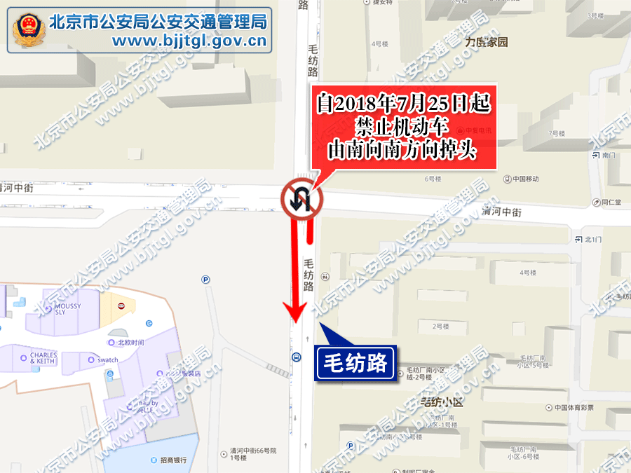 二、毛纺路口禁止机动车由南向南方向掉头。