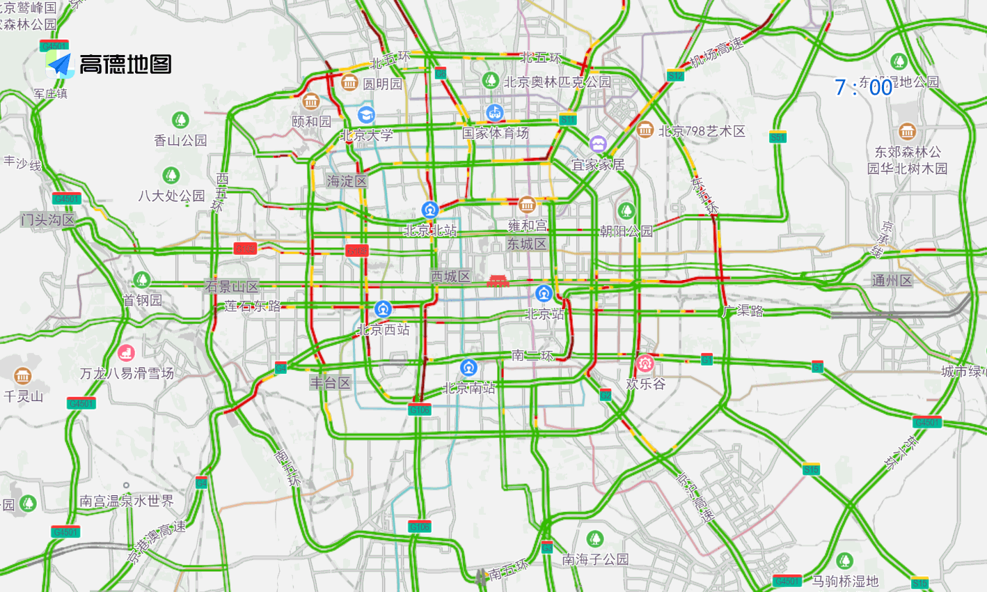 早高峰期间,二、三、四环,东、西、北五环,菜户营南路、建外大街、通惠河北路、西直门北大街、万泉河路、莲石东路、莲花池西路等道路以及肖家河桥、天宁寺桥、望和桥等桥区节点预计将出现车行缓慢的情况。高速公路方面,京藏高速、京承高速、京通快速、京港澳高速、机场高速等将出现进京潮汐车流。高峰时段为7:50—8:30。