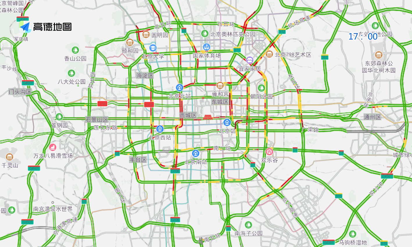 晚高峰预计从16:30开始,东、西部城区的二、三、四环北段南北双向,丰体南路、建外大街、通惠河北路、莲石路、莲石东路等道路出城方向通行压力逐步增大,京藏高速、京承高速、京通快速、京港澳高速、机场高速等将出现出京的潮汐车流。