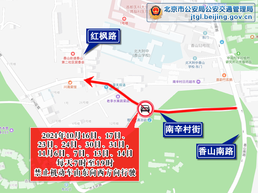 香山红叶观赏季期间,游客数量将大幅增加,为确保红叶观赏季期间香山地区的道路交通安全与畅通,2021年10月16日、17日、23日、24日、30日、31日,11月6日、7日、13日、14日,每天7时至19时,将对南辛村街(红枫路至香山南路段)采取禁止机动车由东向西方向行驶的临时交通管理措施。