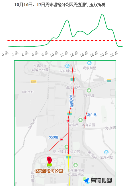 周末(10月16、17日),去年开放的温榆河公园将举办音乐节活动,预计9—22时周边京承高速、火沙路等车流量将明显多于平日周末,11—13时、19—21时车流将最为集中。