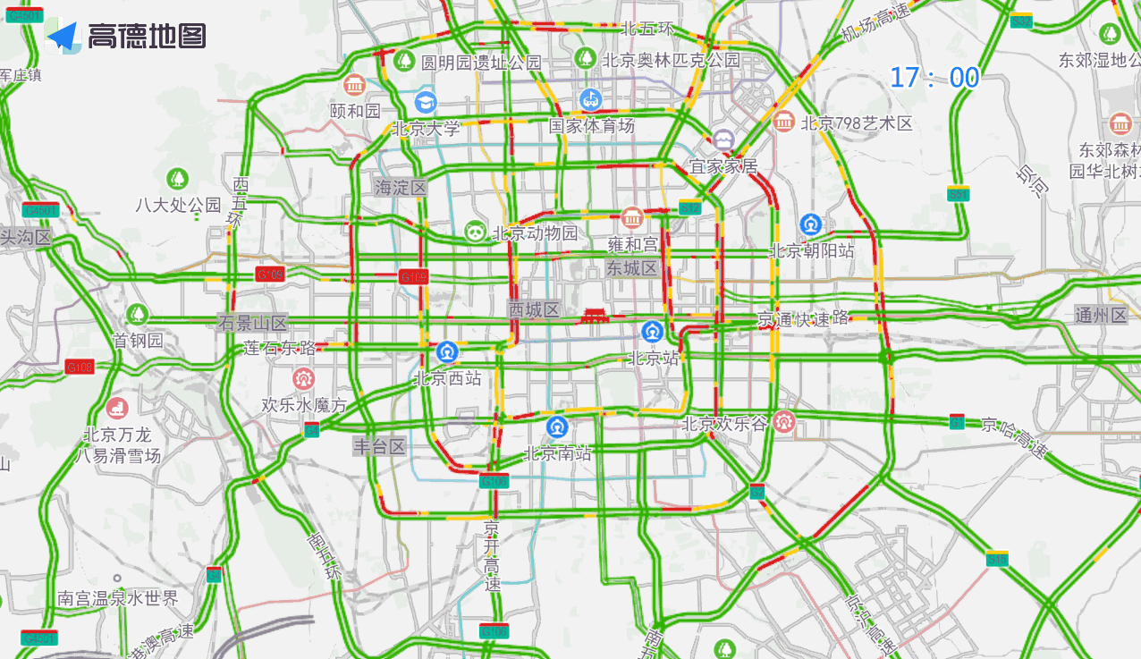 晚高峰通行压力比早高峰大,东、西、北二、三、四环,东、西、北五环,东六环部分路段,以及建外大街、通惠河北路、莲石东路等城区道路出京方向通行压力较大,京藏高速、京承高速、京通快速、京港澳高速、机场高速等将出现出京的潮汐车流,高峰时段为17:30—19:30。