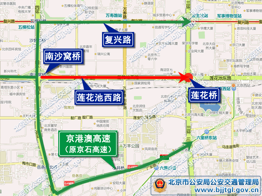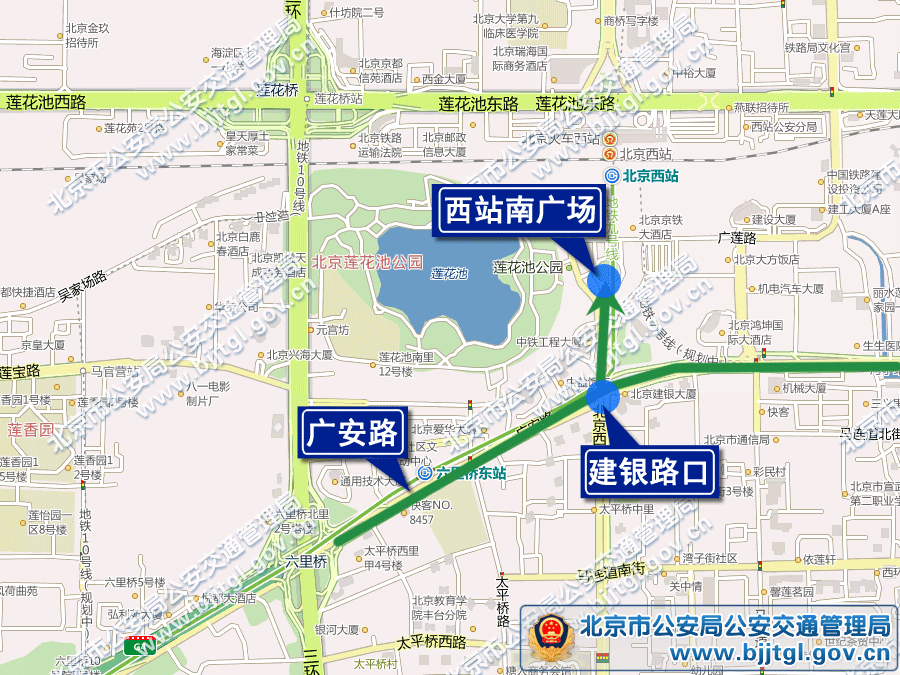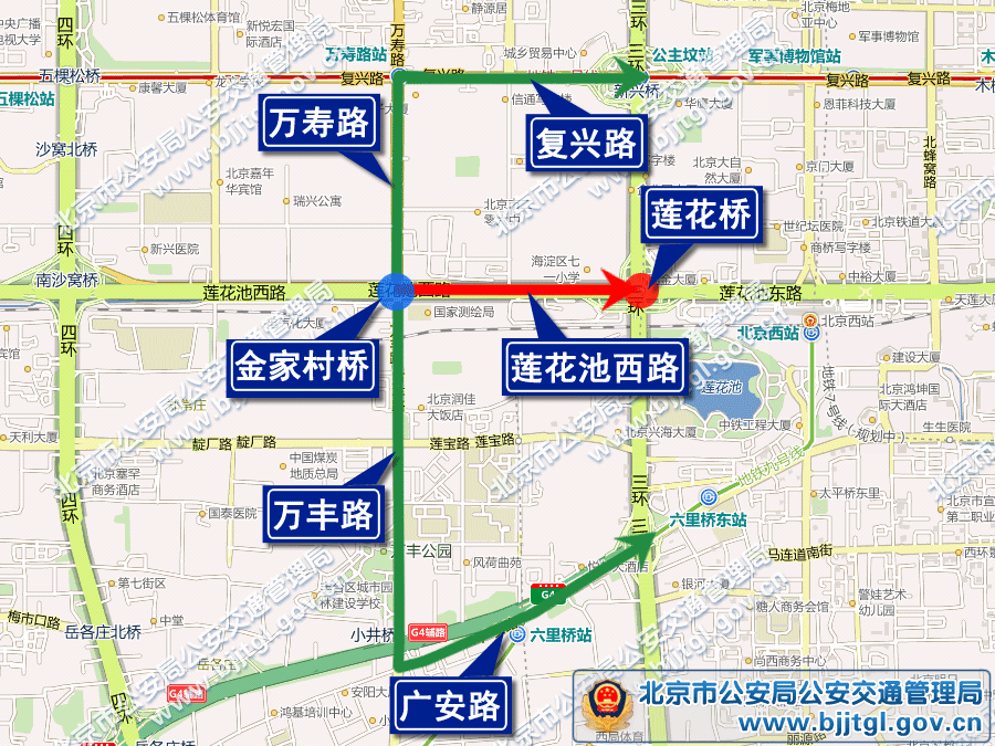当莲花池西路一线西向东车行缓慢时,城西部地区的进城车辆可提前从南沙窝桥经西四环绕行京港澳高速或复兴路;也可由金家村桥经万丰路、万寿路绕行广安路、复兴路。