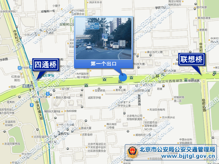 准备经北三环去往四通桥东北侧大型影院的车辆,在经过联想桥后,需要在第一个出口驶出主路,进入辅路行驶。如果错过这个出口,将驶入四通桥东向东方向的掉头车道,无法到达四通桥东向西方向辅路。当北三环西段车流集中行驶缓慢时,过往车辆可以绕行知春路行驶。