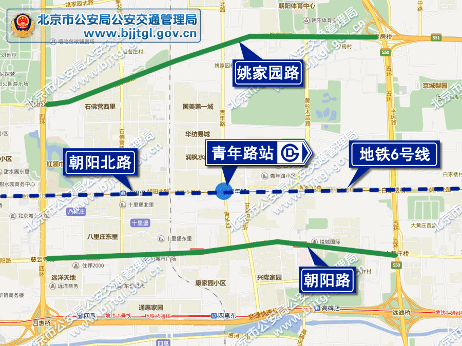 3、朝阳北路青年路口,不仅在工作日高峰时段车流量较大,在周末的白天因去往周边大型商场的车多,青年路口也容易出现区域行驶不畅的情况,过境车辆可选择朝阳路或者姚家园路等周边道路绕行,也可乘坐地铁六号线在青年路站下车前往。