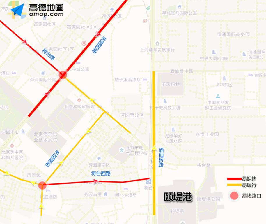 周末期间,商圈出行强度仍将很大。东部城区、北部城区、中心城区等商圈周边道路可能出现短时车流量大和拥堵情况。从近期周末看,酒仙桥的颐堤港周边车辆较多,易发生拥堵或缓行的情况。准备前往此地的朋友请尽量选择公共交通前往。