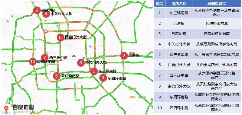 工作日早高峰期间,预计东三环南路、远通桥、肖家河桥、中关村北大街、菜户营南路等路段,以及部分学校周边交通压力较大。