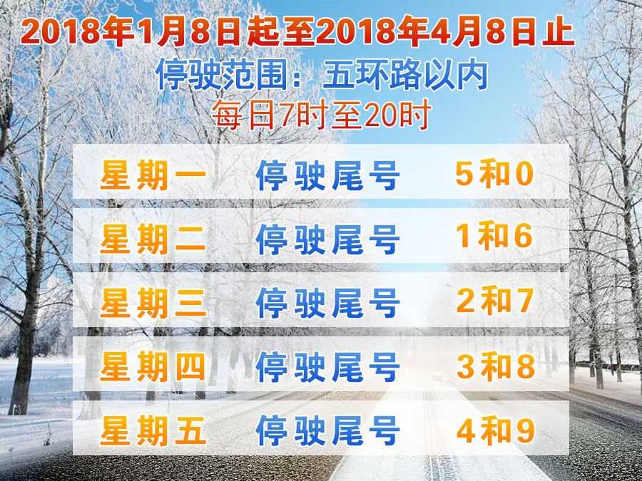 下周,机动车尾号限行将进行轮换。自1月8日至4月8日,星期一至星期五限行机动车车牌尾号分别为:5和0、1和6、2和7、3和8、4和9。轮换后,预计周一早高峰、周五全天交通压力较大。另外,下周后期将进入“三九天”,驾车出行增多,周五晚间交通压力将更为突出。