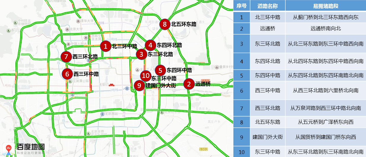 晚高峰期间,预计北三环中路、远通桥、东三环北路、东四环北路、东四环中路、西三环中路等路段容易出现车行缓慢的情况,尾号4和9限行的周五晚高峰交通压力将高于其他工作日。