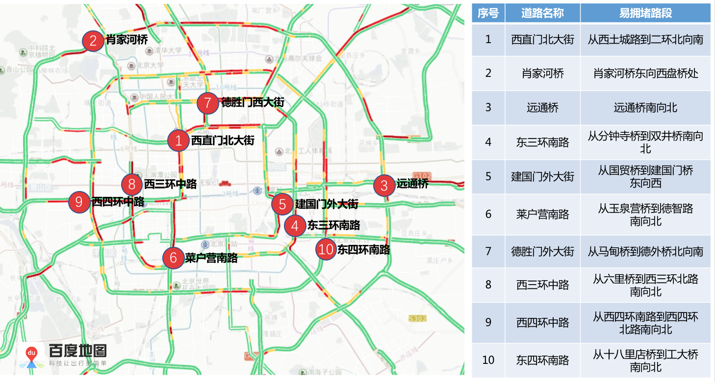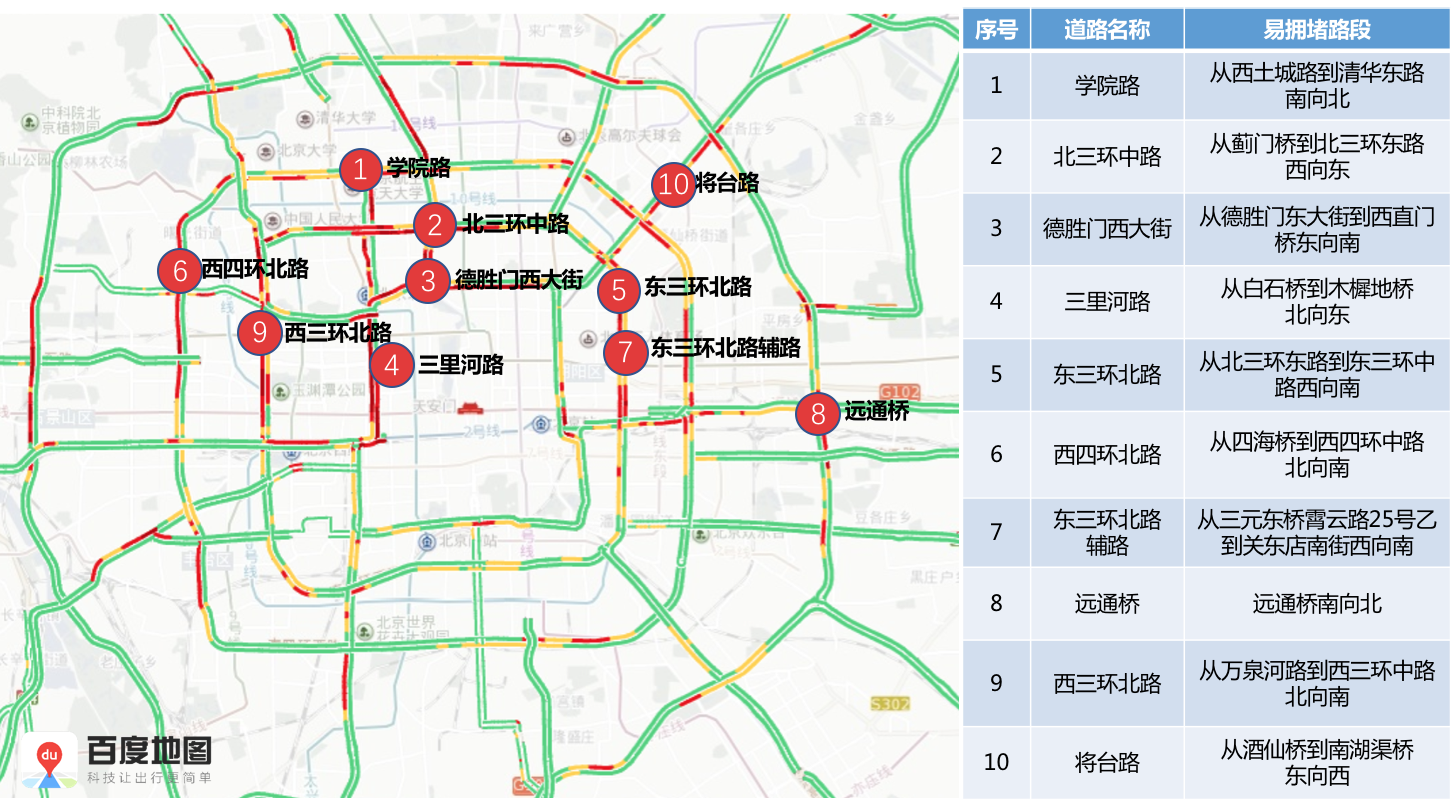 晚高峰学院路、北三环中路、德胜门西大街、三里河路、东三环北路等容易出现车行缓慢的情况,周一和周五晚高峰交通压力将最为突出,17:30—19:30交通压力最大。