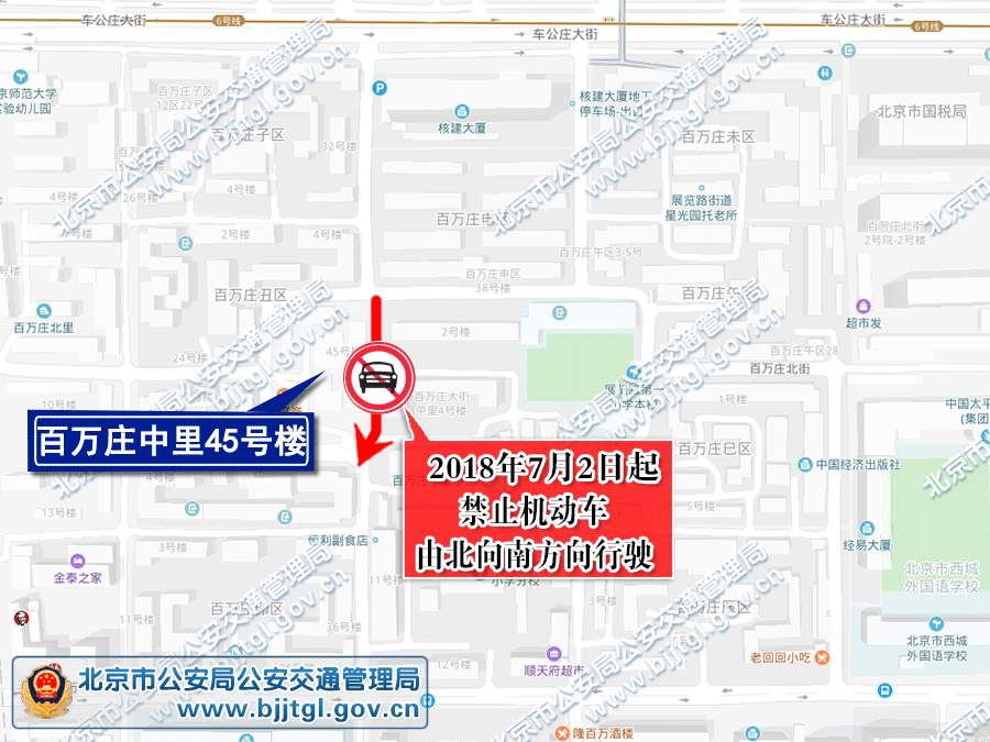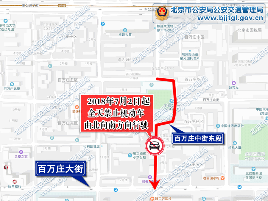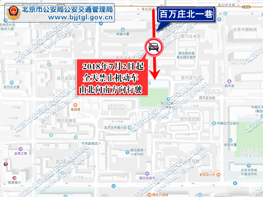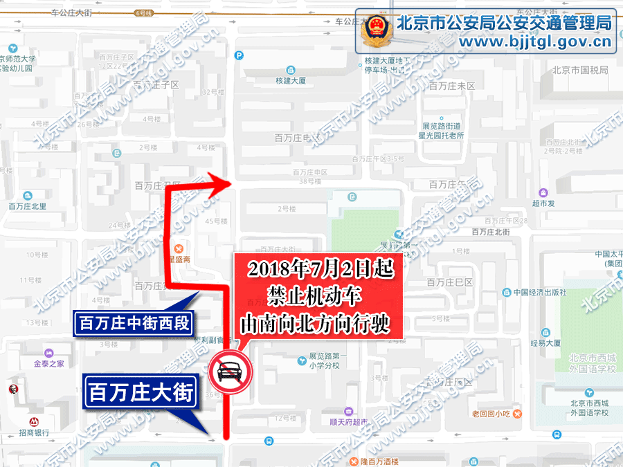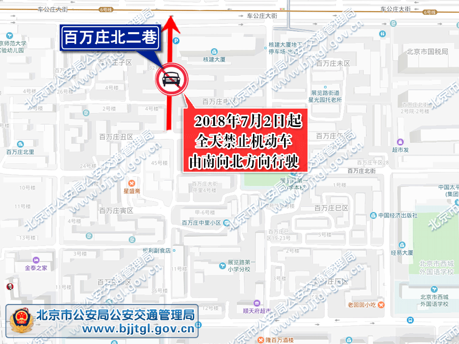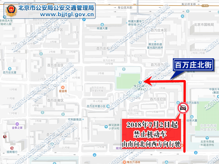 为西城区百万庄地区的交通安全与畅通,根据《中华人民共和国道路交通安全法》的有关规定,决定自2018年7月2日起,对百万庄地区部分道路采取交通管理措施: