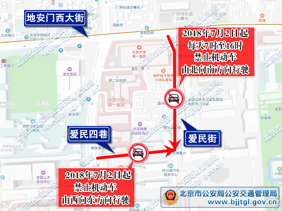 为保证西城区爱民街、爱民四巷的交通安全与畅通,自2018年7月2日起,西城区爱民四巷禁止机动车由西向东方向行驶;爱民街(爱民四巷至地安门西大街)每天7时至16时,禁止机动车由北向南方向行驶。