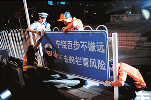 为配合全市交通秩序专项整顿活动的顺利开展,我局精心设计,特意设置了交通安全宣传标牌,安装在长安街等主要大街的中心护栏或便道护栏上。标牌内容既有“行人过街,请您走地下通道人行横道”、“红灯亮时,请您在停止线等候”的功能性提示语,也有通过我局对外网站向市民征集的交通安全温馨提示语,标牌上增加了微笑交警的卡通图案,使其更美观、更贴近大众。