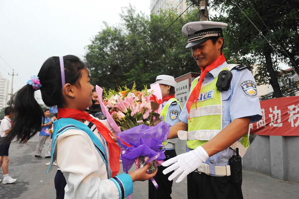 “幸福生活,感谢有你”,开学第一天,丰台区六里桥小学全体师生以鲜花、红领巾、诗歌感谢长期义务维护校园及周边安全的社区志愿者、民警等人员。据了解,随着全国各地校园安全事件的发生,去年以来,莲花池社区居委会及志愿居民们和社区民警一起,在上学、放学时保护孩子们的安全。 来源:京华时报 2010-9-2