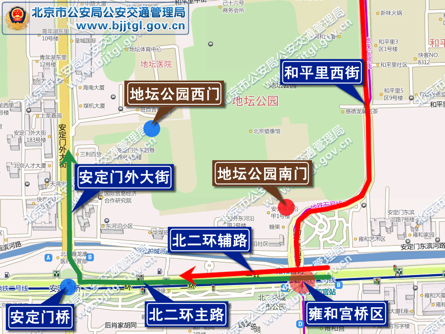 当地坛公园南门周边以及和平里西街出现车行不畅的情况时,将会影响到北二环雍和宫桥区东向西方向辅路车辆的通行,自驾车前往的朋友,可以经北二环主路继续向西,在安定门桥向北,从安定门外大街前往地坛西门。