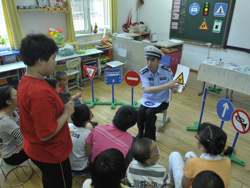 据了解,该校在海淀交通支队的帮助下,开展了多种形式的安全教育,对交通安全意识的培养也是该校重要的科目之一。只有让学生们熟记交通标志,练习如何安全通过马路,在孩子们将来走入社会才有基本的安全保障。考虑到这里的孩子们情况特殊,为了让孩子们在校内能更真实的模拟道路环境,海淀交通支队与学校合作,为学校提供了与马路上一模一样的交通标志标牌和红绿信号灯。在每次的交通安全课上,民警和老师们一起带领学生认识斑马线等交通标识,手拉手带着孩子们练习如何看着红绿灯过马路。据老师介绍,上过交通安全课的孩子们,过马路时安全意识特别强,有效地保护了孩子们的出行安全。