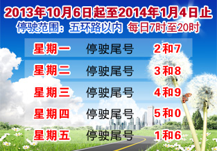 轮换日期为2013年10月6日至2014年1月4日。星期一至星期五限行机动车车牌尾号分别为:2和7、3和8、4和9、5和0、1和6(含临时号牌,机动车车牌尾号为英文字母的按0号管理)。