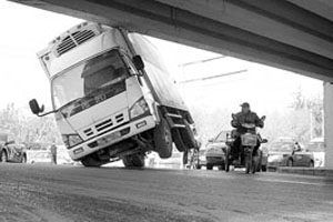 两轮着地,10日上午,朝阳区四元桥桥下,一辆倒霉的货车被卡在桥洞中,宛若“金鸡独立”。直到记者上午10时30分赶到时,司机的同伴还想不通:“怎么能卡成这个样子?”在他们眼前的小货车,左侧两轮悬空,左上角的货车车厢被紧紧地顶在桥沿,已经凹陷,右侧两轮虽然着地,但已经在重压下爆胎。