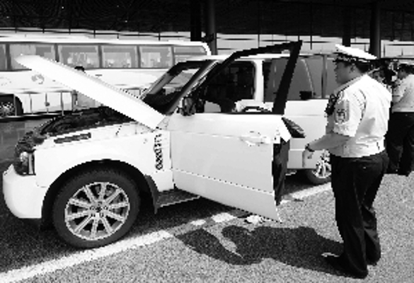 昨天,市交管局涉车案件专业队与首都机场分局交通支队联合在首都机场3号航站楼查处涉牌涉证车辆。图为交警查处到一辆套牌路虎车,因涉嫌使用伪造行驶证且车辆来源不明,该车被交警当场扣留。