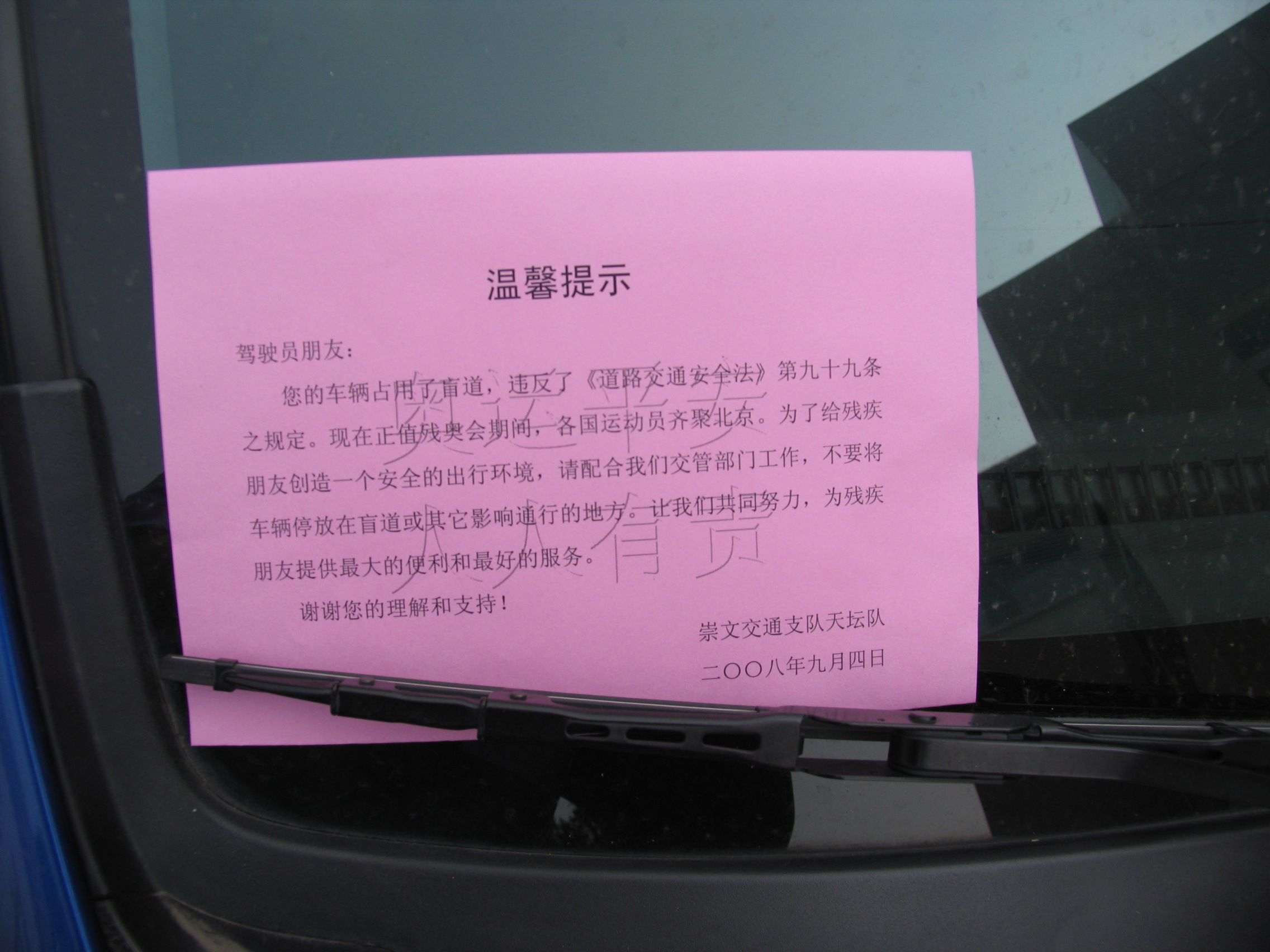 残奥会前夕,崇文支队天坛队结合对管界内违法停车、占用盲道停放车辆的清理整顿工作,专门制定了提示司机不要占用盲道停车的宣传单,为残疾朋友提供安全的出行环境条件。