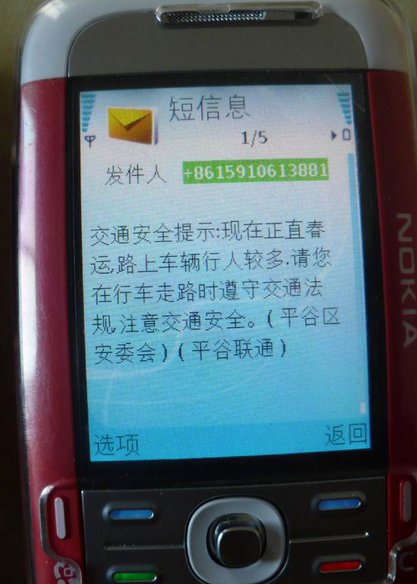 配合“春运”交通安全宣传活动,平谷支队、区安办专门编写了“节日把家归,春运又来到,现在运输正忙时,安全最重要”等温馨提示语,积极协调中国联通平谷分公司,利用自身有利条件,采取用短信群发的形式,向辖区广大手机用户和司机发送,短信侧重对节日期间车辆易发生故障情况和事故处理技巧进行宣传,提示广大出租司机和驾驶员加强安全意识和守法意识,确保行车安全。通过发送一句句温馨的提示语,不仅提高了广大驾驶员的道路交通安全意识,而且寄托了支队民警对广大交通参与者的祝福,营造了和谐的宣传氛围,为全区节日期间良好的道路交通秩序打下坚实基础。