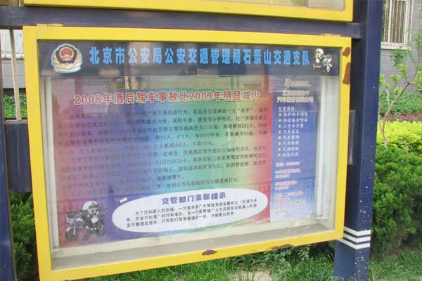为确保展板形式新颖、引人注目,石景山支队专门邀请专业广告公司对色彩、版面进行了精心设计,并得到了北京博瑞裕丰汽车服务有限公司的支持与配合。宣传内容选取了酒后驾车造成家破人亡的悲惨交通事故典型案例,及支队严厉打击酒后驾驶等严重违法行为情况,积极倡导“饮酒不开车,开车不饮酒”的出行准则。新颖亮丽的宣传橱窗、触目惊心的事故案例和热情温馨的交警提示,体现了以人为本的工作理念,增强了人性化交通安全宣传色彩,得到社区干部和群众的一致称赞。