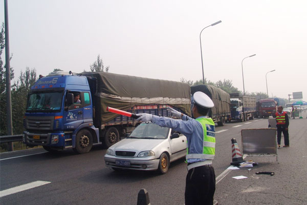 9月15日零时,首都“护城河”工程全面启动,为严守首都西南大门,房山支队在琉璃河检查站、六环葫芦垡口加强警力,认真检查外地进京车辆相关证件及车辆安全性能,做到一车不漏,并对违反规定进入六环路的外地货运车辆进行教育劝返,耐心做好群众宣传解释工作,确保每一辆进京外埠机动车安全性能达标,切实消除各种安全隐患。同时,支队针对京石高速服务区车流量大,容易出现拥堵的现象,根据车流特点重新设置导流指示牌,加设导流指示牌6面,并在服务区入口处码放锥形桶,通过导流使本市车辆通过专用通道快速通行,外埠进京客车、货车分别进入服务区辅路待检区和停车场待检区进行检查办证,有效解决了服务区堵车和乱停车问题,为“十一”营造了良好的外围交通环境。