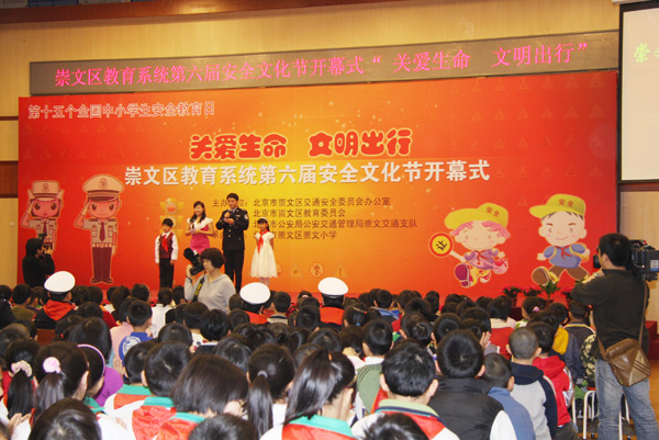 3月29日,由崇文区安办、区教委、崇文交通支队主办,崇文小学承办的2010年崇文区教育系统第六届安全文化节开幕。区教委、纪工委、崇文支队领导,驻区各学校领导、学生共计800余人到场参加了活动。
