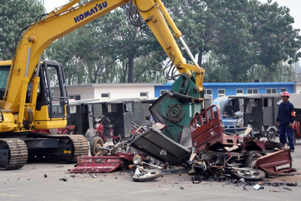 6月20日上午,大兴区治理黑车领导小组办公室在北京天交报废汽车回收处理有限责任公司举行非法运营“摩的”公开销毁仪式。市公安局治安总队、公安分局、大兴区政府办、大兴工商分局及大兴交通支队有关领导到场参加了活动。