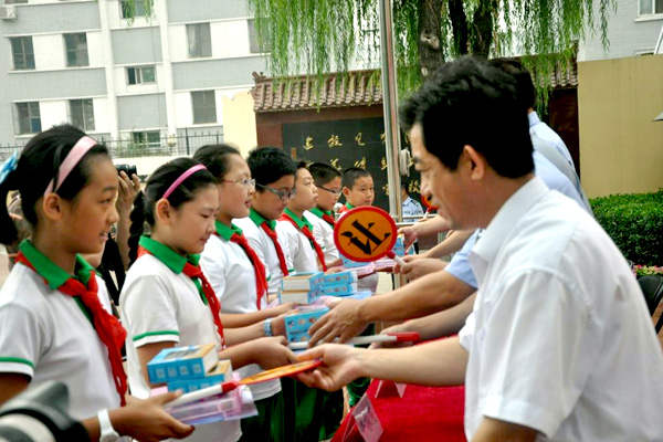活动中,大兴支队民警向师生们介绍了全市开展交通秩序综合整治工作情况,结合中小学生在骑车、走路、乘车中遇到的交通问题及违法造成的严重后果,讲解了相关交通法规常识,教育学生们做一名文明交通参与者,同时肩负交通安全宣传员的责任,向身边的亲戚朋友宣传交通法规,劝阻交通违法行为,提倡文明出行。随后,到会领导向学生们发放了交通安全知识宣传材料及印有交通安全提示语的学习用品,大兴一小的部分同学在民警的指导下,表演了自行编排的交通指挥手势操,受到各位领导及老师、同学们的赞扬。