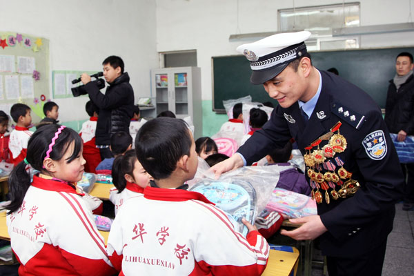 近日,“最帅交警”孟昆玉来到通州区打工子弟学校,向同学们赠送学习用品并开展交通安全宣传。