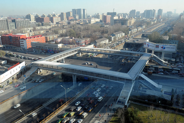 历时一年多的建设,中关村一桥路口环形天桥于2011 年 12 月底建成正式通行。环形天桥有效解决了该路口人车混行的问题,路口及周边区域交通拥堵得到明显缓解。