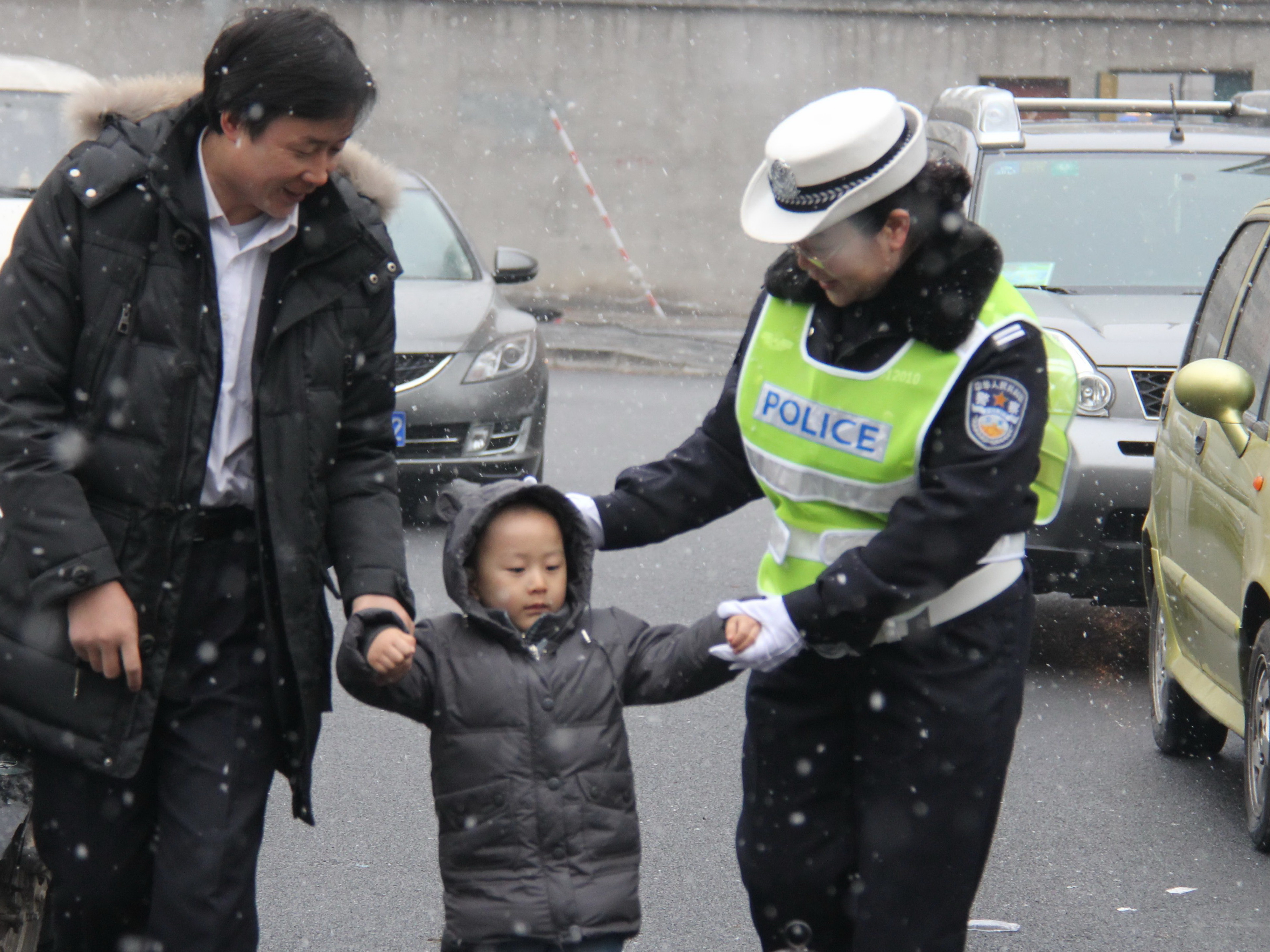 3月2日清晨,通过天气预报得知将有降雪的朝阳支队女民警苗玉竹,提早来到位于九龙小区幼儿园门前的护送岗,冒雪疏导交通,护送孩子们平安过马路,让家长和老师们深受感动。