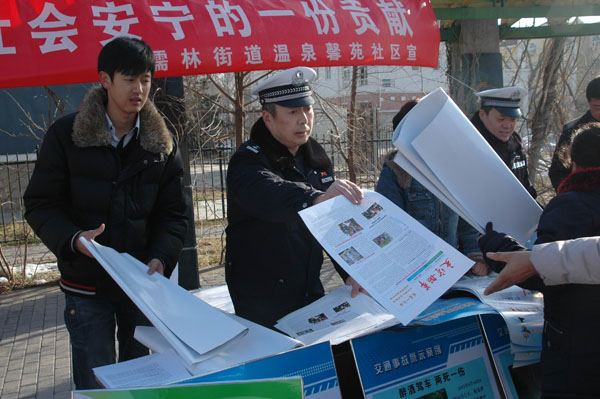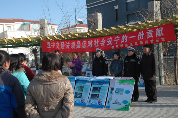 在“全国交通安全日”即将来临之际,延庆交通大队民警和街道办事处联合在辖区儒林街道温泉馨苑小区开展了宣传教育活动。
