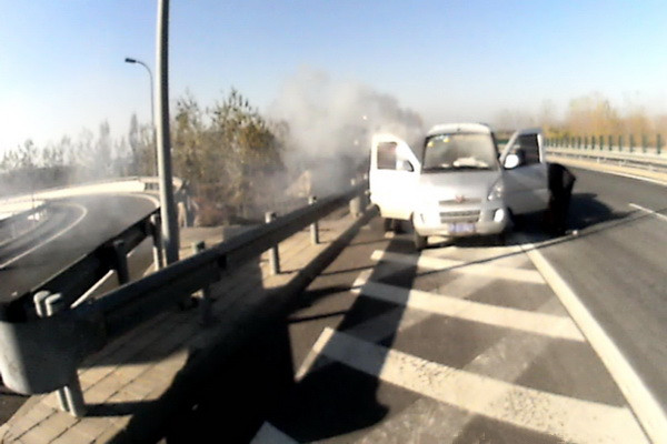 11月12日9时30分,顺义交通支队国展中心中队执勤民警巡逻至天北路机场北线高速路时,发现一辆小客车由西向东停靠在应急车道上,车内冒出滚滚浓烟,司机焦急地站在车旁,束手无措。