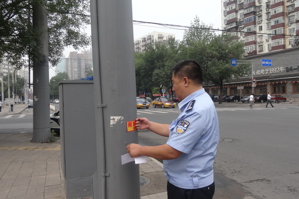 [图]朝阳交警为“雨箅口”粘贴温馨提示标志