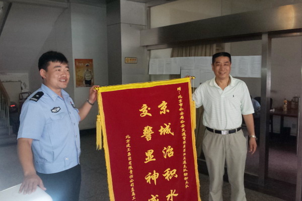 施工期间,由于劲松大队的积极配合,排水工程进度未受任何影响,过往群众的交通安全也得到了保障。为此,6月20日中午,北京建工集团有限责任公司代表来到劲松大队,将一面有写“京城治积水 交警显神威”的锦旗送到民警手中,感谢劲松大队全体民警对潘家园桥、十里河桥周边地区安装排水工程占道施工的全力支持和帮助。