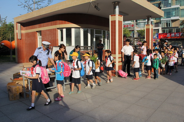 民警在校方的支持和协助下,将行人、非机动车典型交通事故展板摆放到校园门口,用形象生动的语言讲解事故诱发的原因及预防交通事故的基本知识。此外,充分利用流动宣传车滚动播放文明交通动画片,向同学们讲解如何安全过马路、乘车须知以及发生交通事故如何处理等交通安全常识。最后,民警向学生发放了印有交通安全提示语的彩笔、笔记本以及《致中小学生家长的一封信》、《小手拉大手共创首都文明交通环境》宣传海报,号召同学们从小树立交通安全意识,监督家长驾车时系好安全带,不接打电话,杜绝“三超一疲劳”等严重交通违法行为。