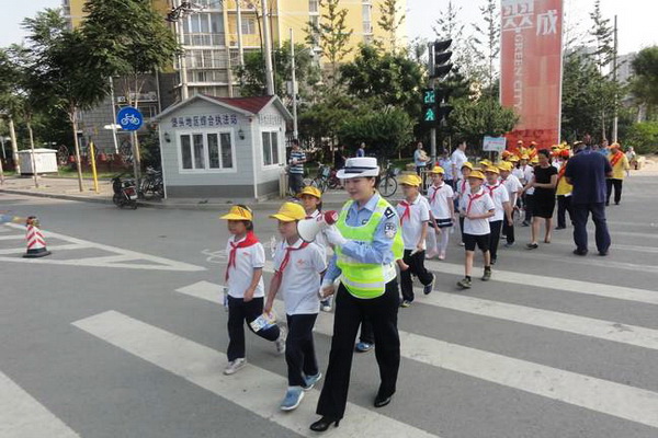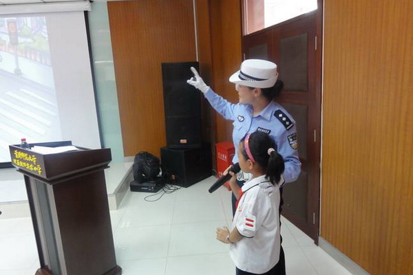 在翠城十字路口,民警正通过现场讲解和亲身示范,告诉孩子们如何安全通过信号灯路口。