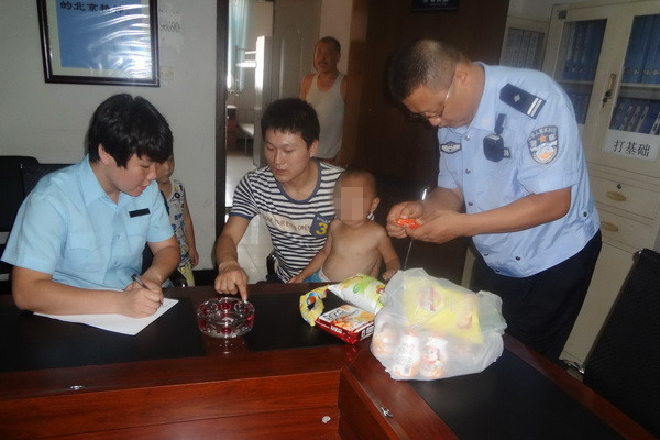 8月5日9时30分许,大兴支队旧宫中队民警孔泉、王东林巡逻到黄亦路与中轴路交叉口时,发现有个小男孩站在路边不停哭泣,旁边并没有家人陪同照顾。民警意识到情况不妙,于是立即下车询问,但孩子一直抿着嘴不说话,只是不断摇头。无奈之下,民警只得先将小男孩带回队里。为了消除孩子的紧张、恐惧心理,民警特意买来了牛奶、薯片、饼干和糖果等食物。在民警的悉心照顾下,孩子的情绪逐渐稳定下来。