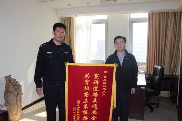10月12日上午,北京电子科技职业学院负责人将一面写有“宣讲道路交通安全 共育祖国未来栋梁”的锦旗送到了开发区交通大队。