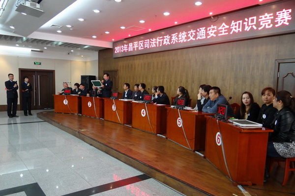 今年5月份以来,昌平区司法系统以《道路交通安全法》、公安部123号、124号令为主要内容,组织开展了“交通安全在我心中”主题交通安全知识竞赛,各单位经过初赛、复赛形式,通过层层选拔,共有六支代表队选手脱颖而出,参加了最后的总决赛。决赛中,选手们进行了个人必答题、小组必答题、抢答题、大家来找茬、风险题等五轮竞赛,台上主持人和台下观众互动,共同参与交通安全知识问答,把比赛推向高潮。