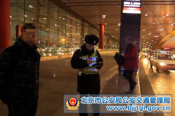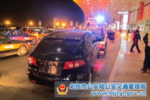 近日,机场交通支队的民警在航站楼指挥疏导时,发现一辆贴有临时号牌的黑色无牌别克轿车违法停放在三号航站楼2号门,为保障其他接送旅客车辆正常通行,民警决定将该车拖移至停车场。