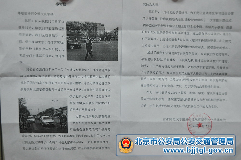 在此,我们代表学校2000名领导、老师、学生、家长向这位协管员叔叔表示深深的感谢。同时,感谢沙河交通队对我校安全工作的大力支持。
