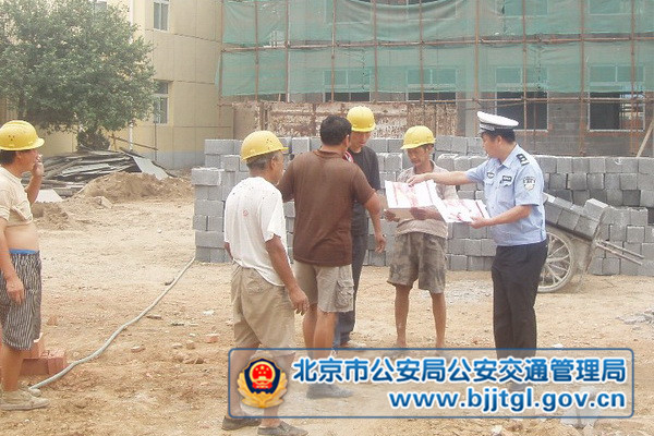 7月10日下午,房山区城关街道顾册村建筑工地的工人们在房山交通支队民警的组织下,观看了预防交通事故宣传展板,学习文明交通宣传材料,听民警讲解如何文明出行,避免交通事故的发生,并在民警引导下,认真按照宣传材料内容规范自身的交通行为。 民警主动深入建筑工地、来到外地务工人员身边开展宣传活动,提示大家安全出行、保证人身安全,让施工工人们很受感动,大家说来北京最不适应的就是路宽车多,而此次宣传活动“让我们感到了首都的温暖”。