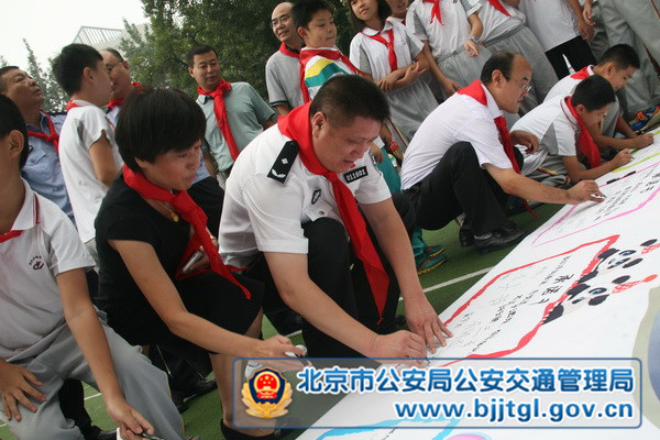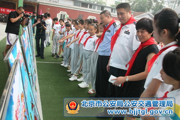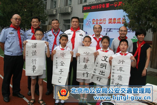 到场领导向小学生们颁发了“小小交通安全监督员”聘书,发放了反光标识书包,小学生和家长代表在国旗下宣读文明出行倡议书和响应书,庄严承诺不购买、不驾驶、不乘坐非法车辆,自觉做到文明出行。随后,学生们精心表演了《安全在我心?文明伴成长》童谣,家长和学生现场通过书法、绘画和寄语,展示了对交通安全理念的解读和承诺,以表达对净化首都交通环境的信心和决心。