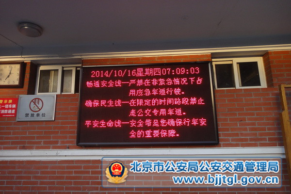 近日,海淀甘家口地区的劳关学院、纺织设计院等单位的户外显示屏上添了新内容,滚动播放杜绝“三条线”违法宣传语,时刻提示单位驾驶员提高交通安全意识、自我保护意识,深刻认识在非紧急情况下占用应急车道、违法占用公交专用车道以及开车不系安全带的严重危害,自觉摒弃交通陋习。
