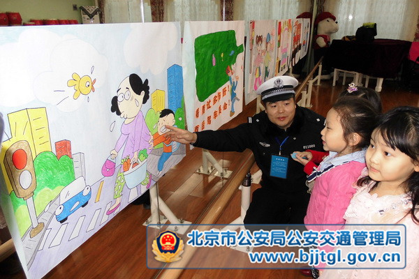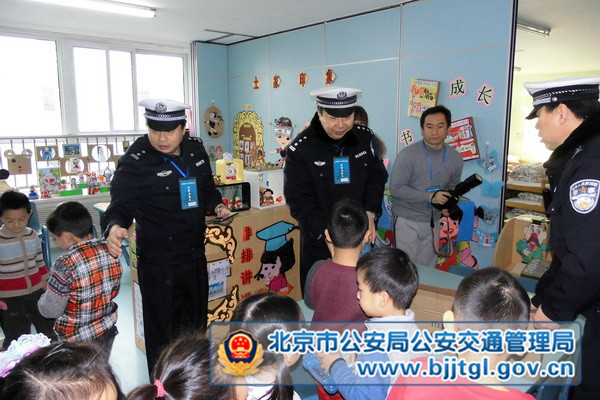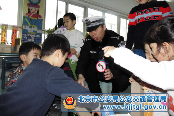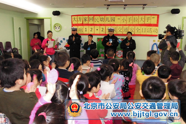 12月2日是一年一度的全国交通安全日,这天,东城交通支队联合区教委在辖区大方家幼儿园举办了一场“小手拉大手”唱响122全国交通安全日主题活动。 活动中,各位交警叔叔与幼儿园的小朋友们一起搭积木、做游戏,一起参观孩子和老师们提前绘制好的交通安全漫画,在欢快的氛围中为小朋友介绍各种交通标志 的作用,提示他们从小养成文明出行的良好习惯。为勉励孩子们好好学习、争做文明交通小使者,东城支队的民警此行还特意带来了转笔刀和蜡笔等学习用具,在活 动最后发放给每一位小朋友。