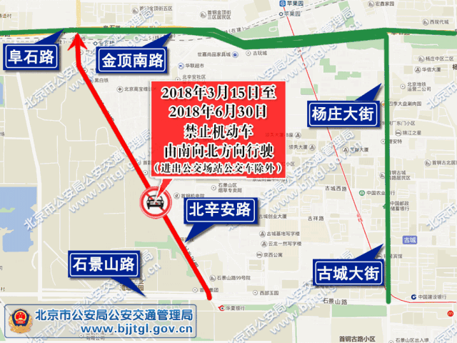 因石景山区北辛安路(石景山路——阜石路)道路施工,2018年3月15日至2018年6月30日期间,北辛安路(石景山路——阜石路)禁止南向北方向机动车通行(北辛安路南口至公交场站路段,进出公交场站公交车除外)。过往车辆可绕行古城大街、杨庄大街、阜石路、金顶南路。